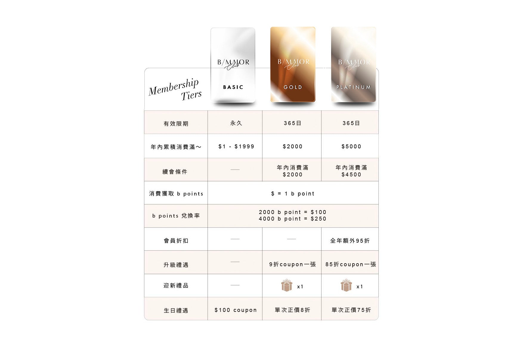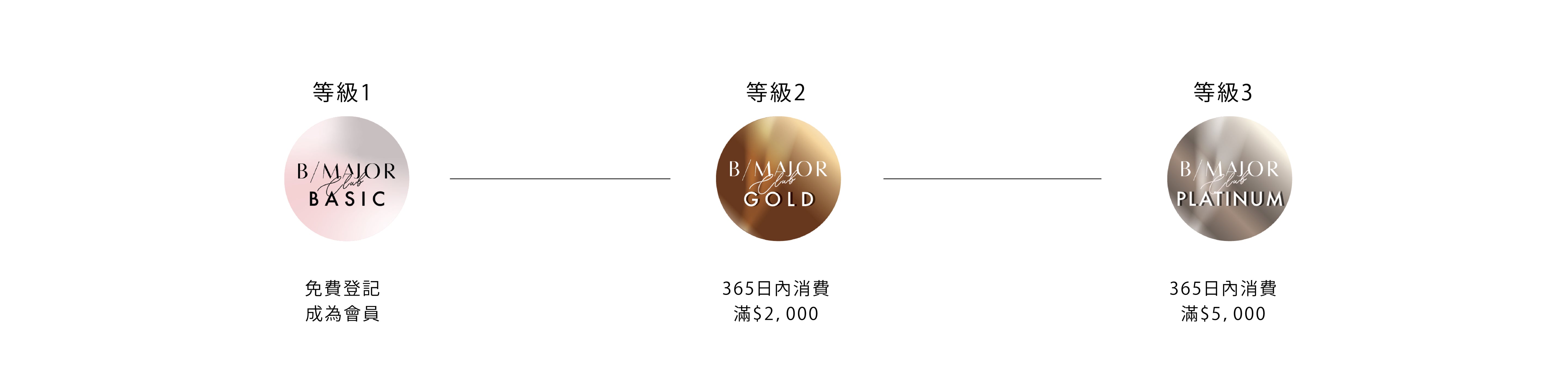 B/MAJOR CLUB 會員一年內累積消費滿指定金額,即可升級及享用更多會員優惠: